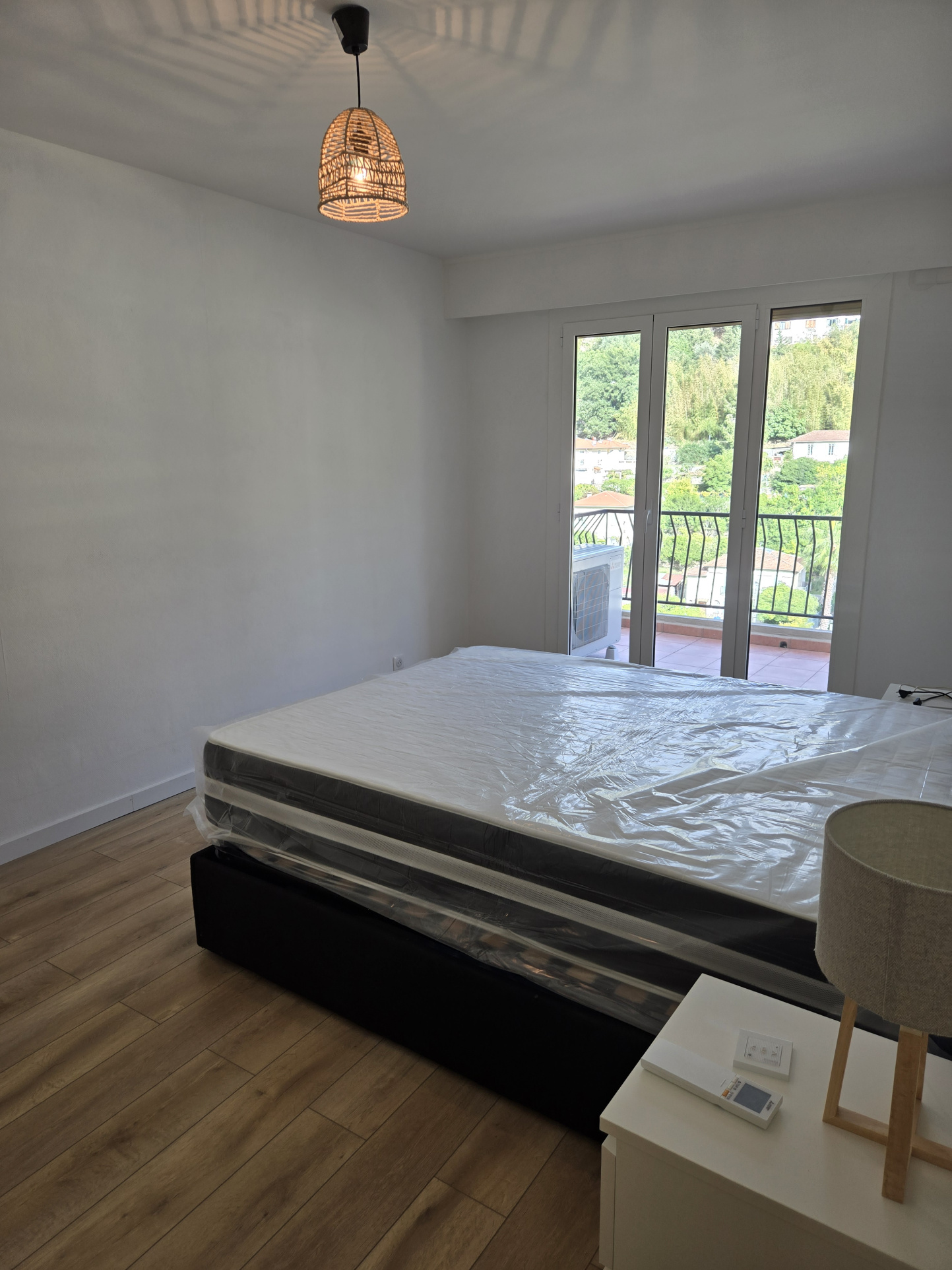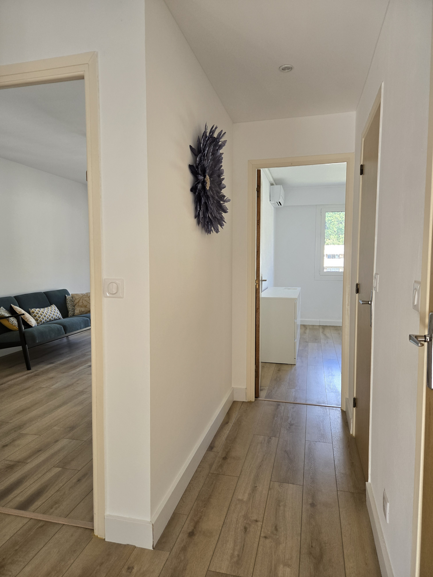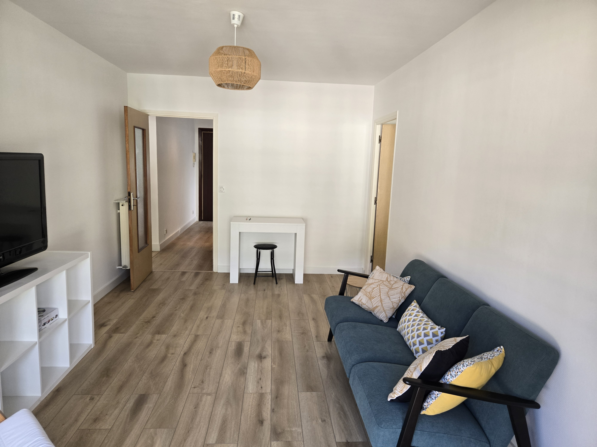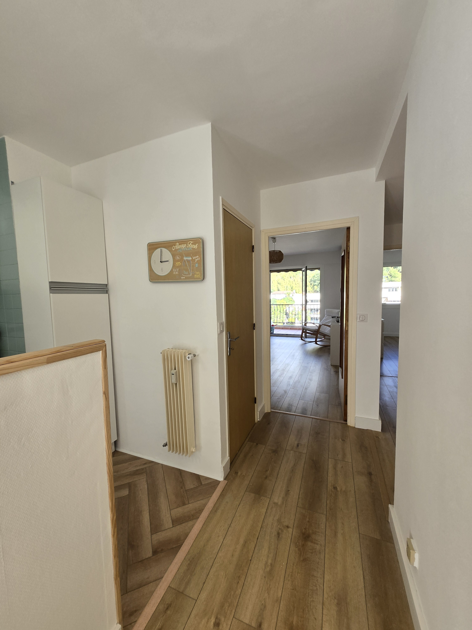 entrée, cuisine équipée et meublée, débarras, trois chambres, séjour, salle d'eau, wc séparés, balcon