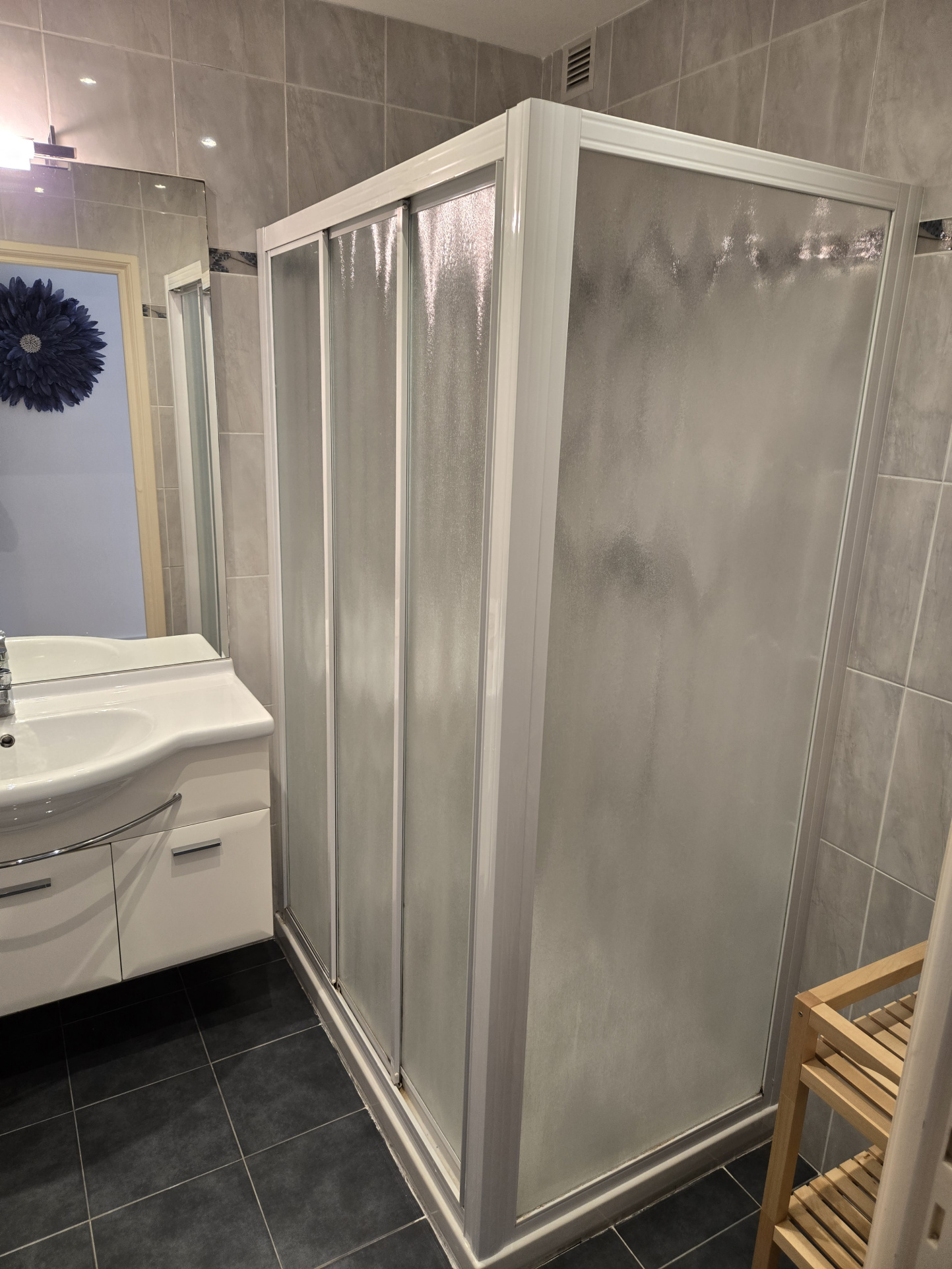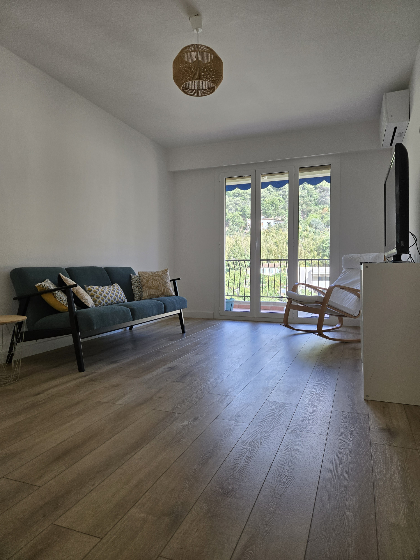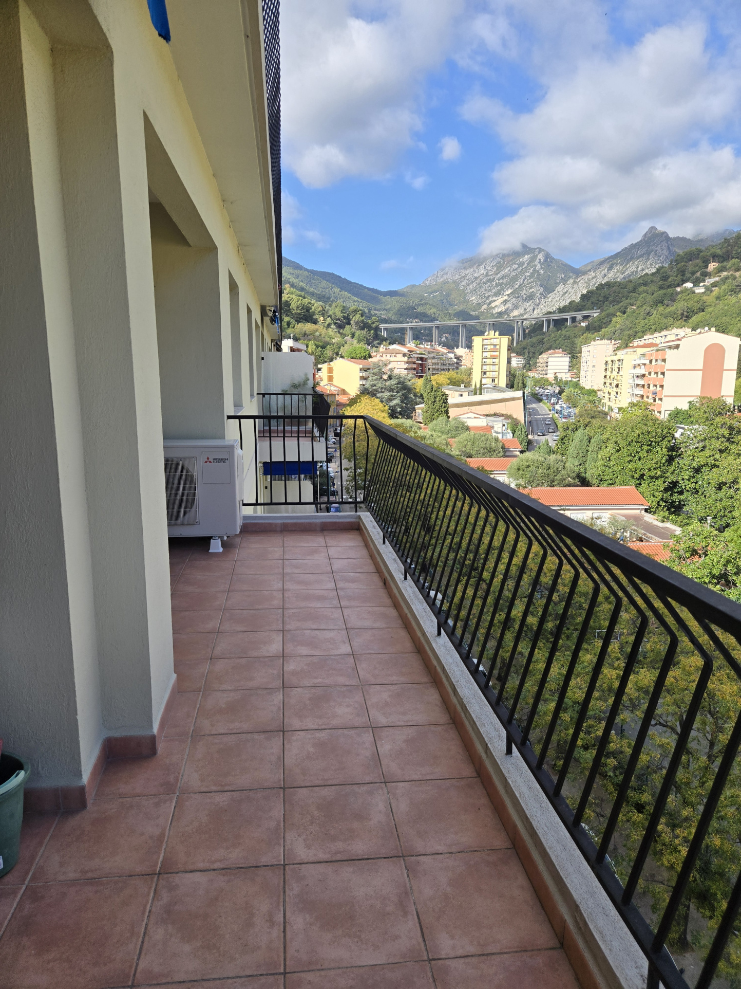 entrée, cuisine équipée et meublée, débarras, trois chambres, séjour, salle d'eau, wc séparés, balcon