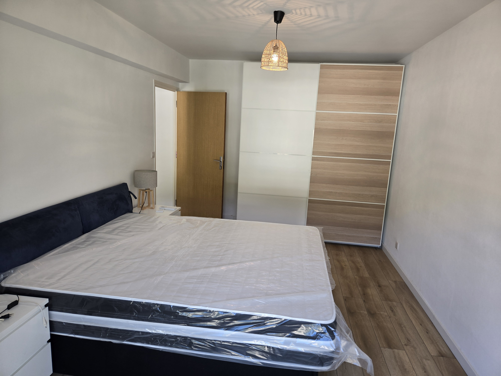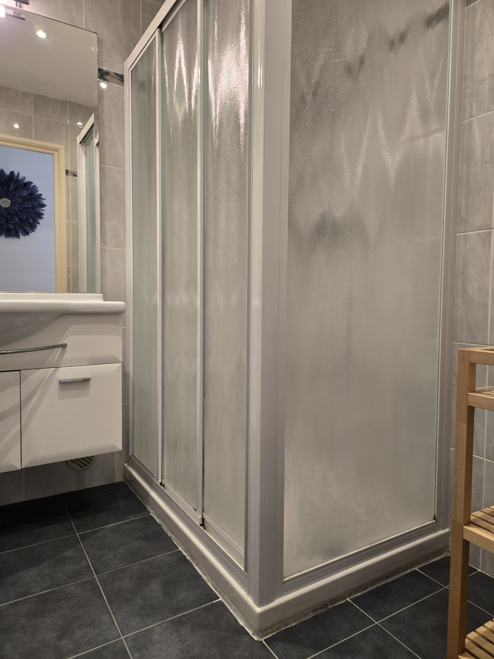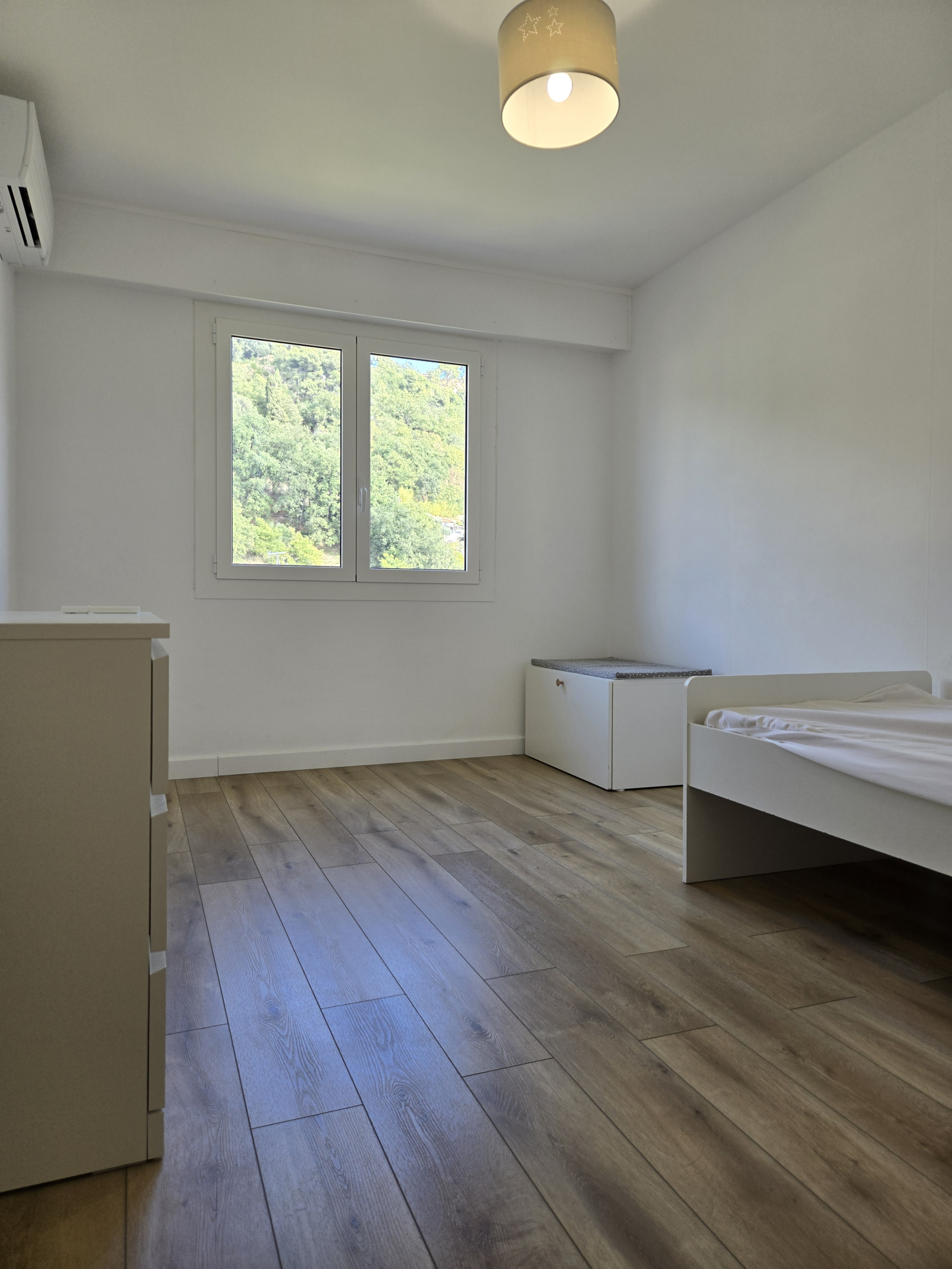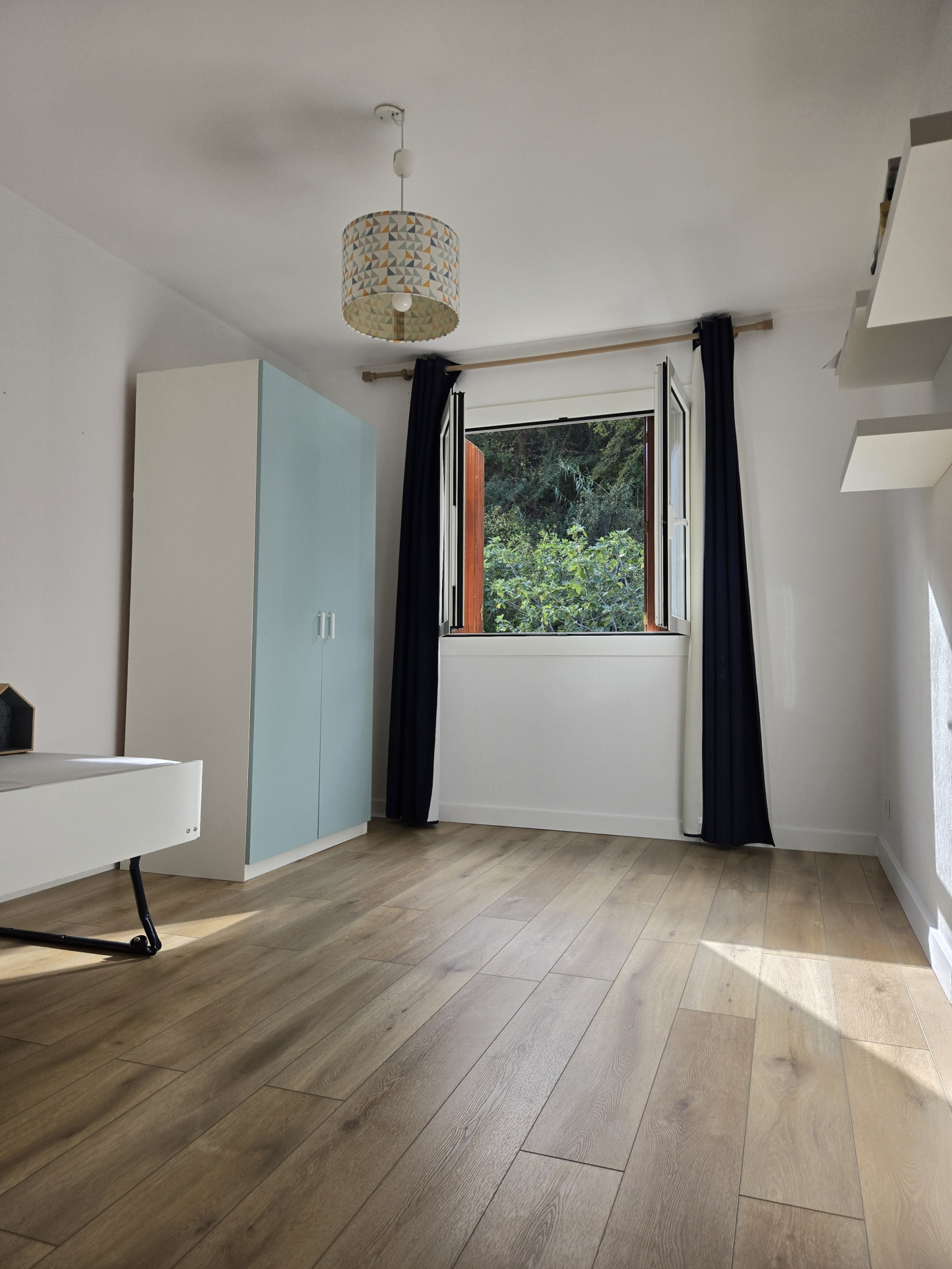 entrée, cuisine équipée et meublée, débarras, trois chambres, séjour, salle d'eau, wc séparés, balcon